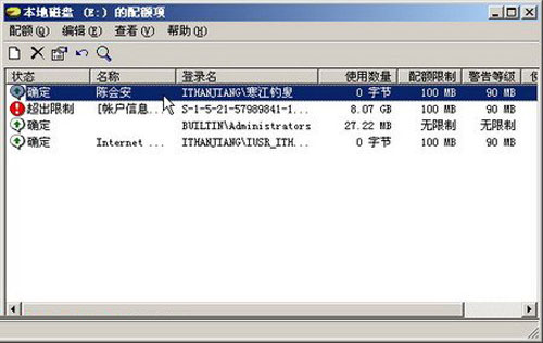 在win2003系统中,由于共享文件的权限用户可以无限制的对共享文件夹写入数据,所以很容易导致共享文件夹所在磁盘分区空间紧张不够,因此,我们就要对共享文件夹所在的磁盘进行完美的配额,保障数据的正常写入。