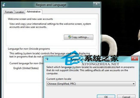 进入Control Panel→All Control Panel Items→Region,将其中的“Location”和“Aministrative→Current Language for non-Unicode programs”分别改成“China”和“Chinese(Simplified, PRC)”。