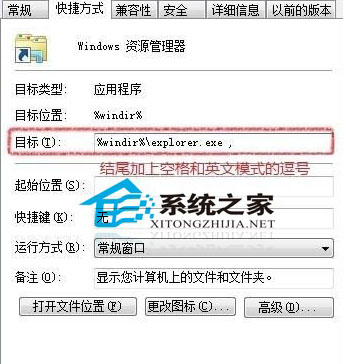 在锁定文件夹处右键,继续右键 Windows资源管理器,选择属性,将打开的选项卡中“目标”改为“%windir%explorer.exe ,”即加上一个空格和英文模式的逗号即可“ ,” 这样就可以了。