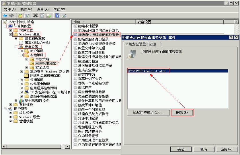 在Windows设置→安全设置→本地策略→用户权利分配“通过终端服务拒绝登陆”中,