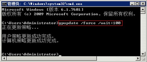 3、按第1步骤运行:cmd,在CMD命令提示符窗口中输入:gpupdate /force /wait:100,即可强制刷新让已经修改的组策略设置立即生效。如下图所示: