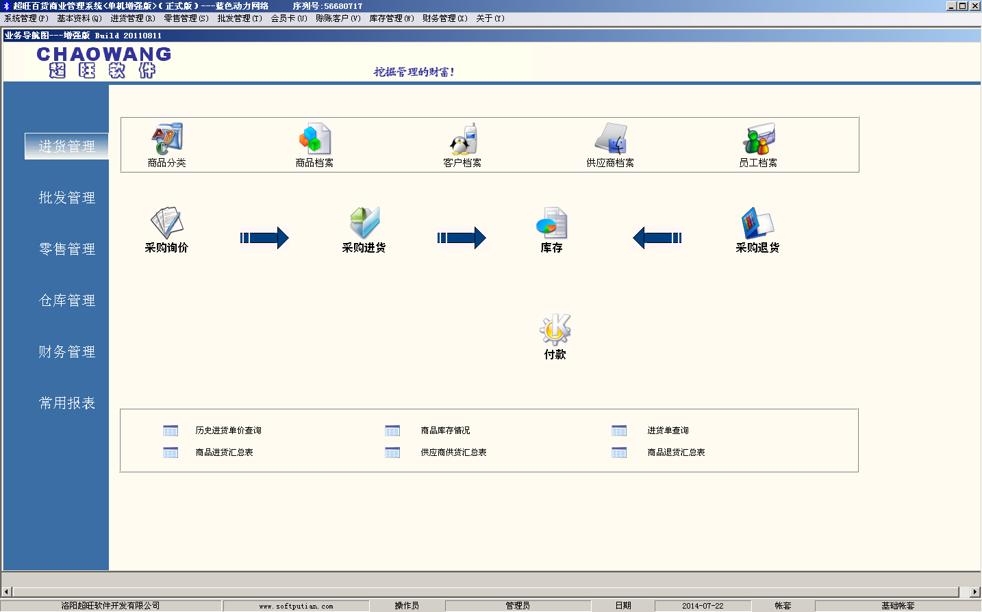 《超旺商业管理系统》的“单机标准版”可广泛应用于商业贸易、0售批发行业(中小型企业和个体经销商)。如食品饮料、超市POS收银、服装鞋帽、物资、化妆品、医药及医疗器械、电脑及配件、通讯类产品、汽车及配件、图书、摩托车及配件、机电化工、五金交电、日用百货、建筑材料、家俱、装饰材料、纺织配件等等。 本系统是现代商业管理模式与电脑信息技术的完美结合。它实用、易学、核心功能是管理商品的进、收银、盘点等物流业务。用户可以随时查询商品库存及进销存情况,任意时间段的商品或客户、职员、各经营网点销售排行榜和利润排行榜等经营管理中重要的统计数据。 用户无须懂财务及仓库管理知识,仅简单填写收银、进货、盘点单据,即可随时查看公司所有统计数据,给出各类进销存财务报表。初学者无须懂电脑,自学上手,一用就会。