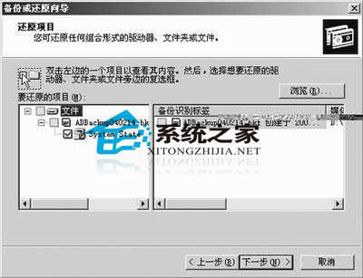 在进入目录服务还原模式后,依次点击“开始→程序→附件→系统工具→备份”,在打开的“备份或还原向导”对话框中点击“下一步”按钮进入“备份或还原”选择对话框,选择“还原文件和设置”。在“还原项目”对话框中选中备份文件(图2)。