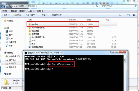 2.在打开的cmd模式下,输入创建命令“md e:wenjian..”创建新的文件夹,记住文件后面要加两个点哦,然后回车E盘下就会出现你创建的文件夹。