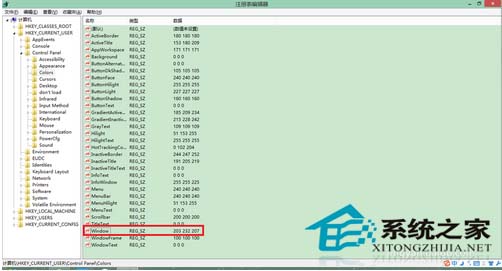 3、最后点击“window”,右击鼠标选择“修改”,将其值改为204 232 207,重启系统就可以了。