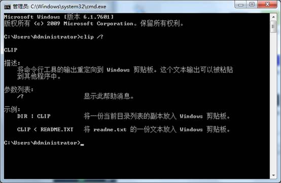 2.打开如下界面后,输入“clip /?”回车确定,如下图所示(p与/之间有空格)