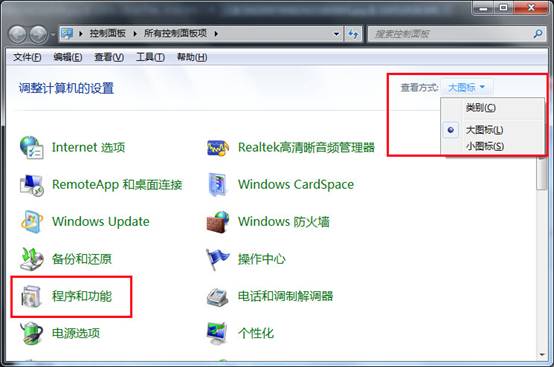 2、打开控制面板后,将查看方式修改为“大图标”,然后点击“程序和功能”,如下图所示: