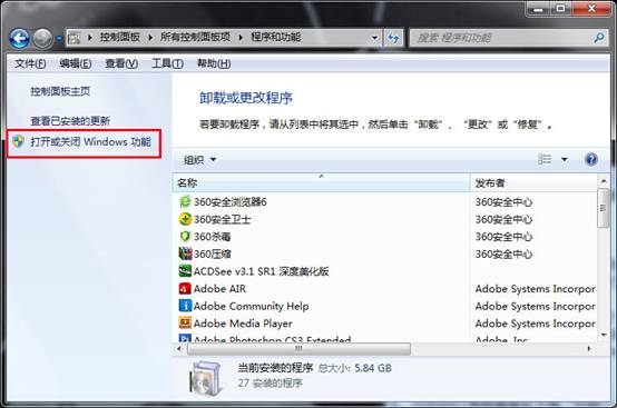 3、进入到程序和功能窗口后,点击“打开或关闭windows功能”,如下图所示: