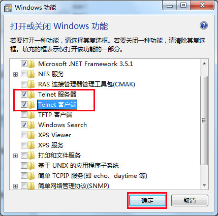 4、在弹出的打开或关闭windows功能窗口中找到“telnet服务器”和“telnet客户端”将这两项勾选起来,然后点击“确定”保存修改就可以了,如下图所示: