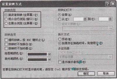 弹出“设置放映方式”对话框,即可在“放映类型”选项区中看到3种放映方式,如下图所示。