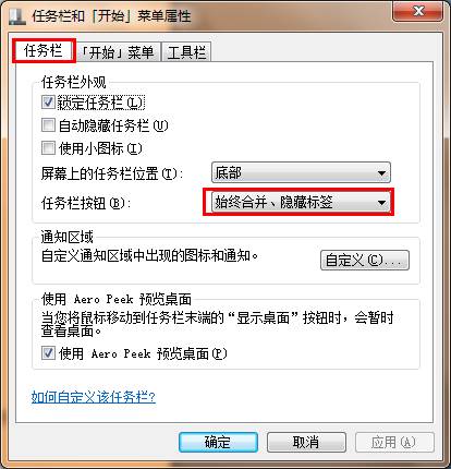 2.在弹出的“任务栏和开始菜单属性”窗口中将“任务栏按钮”后面的下拉菜单设置将“始终合并、隐藏标签”改为“当任务栏被占满时合并”,点击“确定”,如下图所示: