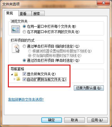 2.在弹出的文件夹选项窗口中将“显示所有文件夹”和“自动扩展到当前文件夹”选项勾选,然后点击“确定”按钮即可;如下图所示: