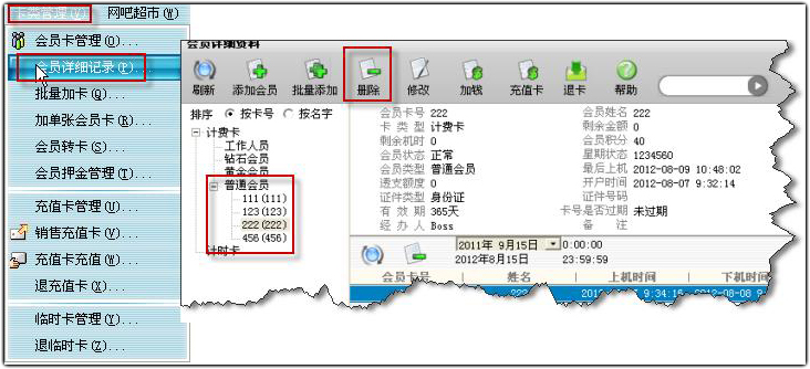 如果要删除单条记录则:依次打开,卡类管理会员详细记录选择要删除的卡的某条记录,点最上面的删除 即可如下图: