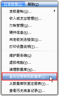 备份:在服务端“日常管理”菜单下,选择“备份注册表到数据库”,然后设置一个备份的名称,例如:春节优惠活动费率,中秋节优惠活动费率等。