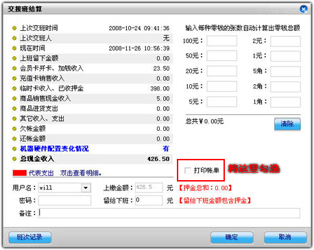 2:如果网吧有安装打印机,需要对交班的账目进行打印,可以勾选交班表中的打印