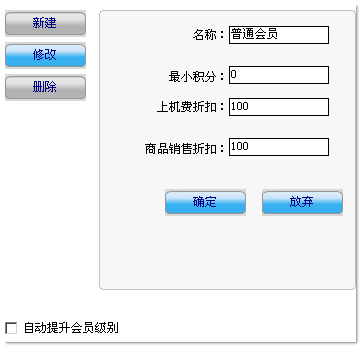 依次设置好会员名称、最小积分、上机费折扣和商品销售折扣后点确定即可。