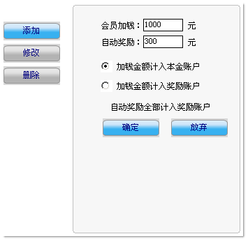 加钱金额计入奖励账户:将会员实际加钱的金额计入奖励账户