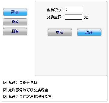允许会员积分兑换:勾选上后会员才能进行积分兑换;如果不勾选,“允许服务端可以总的现金”和“允许会员在客户端积分兑换”两个功能都无效