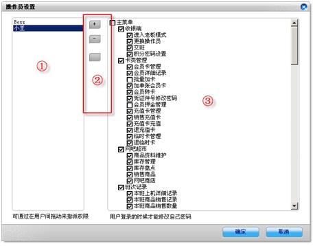 ①、已经存在的操作员列表,选中某操作员,将期拖放到其他操作员上,可以复制此操作员的权限给指定的操作员。
