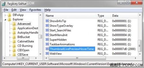 WindowsCurrentVersionExplorerAdvanced’, 鼠标右键点选高级设置‘Advanced’,再选中‘New DWORD’进入‘ThumbnailLivePreviewHoverTime’数值,右键点选该项选择‘Modify’修改,下面就可以选择十进制计 数制,输入一个新值单位为毫秒。