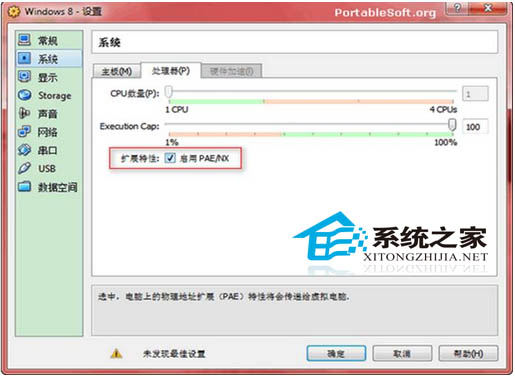 1、打开Win8的虚拟机配置界面,在[系统-处理器]配置页,勾选[启用PAE/NX]的扩展特性。启用后电脑上的物理扩展地址(PAE)特性将会传递给虚拟电脑。