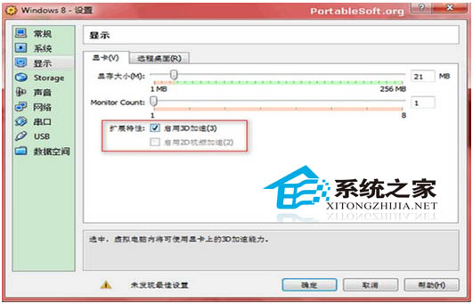 2、 在[显示-显卡]配置页,勾选[启用3D加速]和[启用2D视频加速],这样虚拟电脑将可使用显卡的视频加速能力。