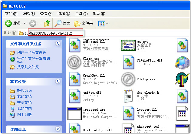 2、将下载的更新包进行解压,依次打开解压后的文件夹‘LocUptClt==〉UptClt2’并将里面的所有更新文件复制粘贴到服务端根目录下MyUpdateUptClt2目录中,如下图: