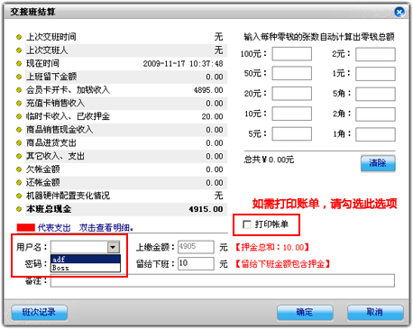 如果设置了多个班次,每个班次一个操作员管理,那么在每个操作员之间就需要交接班,以方便财务管理。与“更换操作员”不同的是,这个操作将写入换班记录和计算上一班到现在这班的现金交结账,并切换到另外一个操作员。