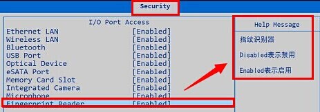 2.右侧提示框中提示“Disabled”表示禁用,那么我们要开启指纹识别功能就要选择“Enabled”,也就是启用。如下图所示