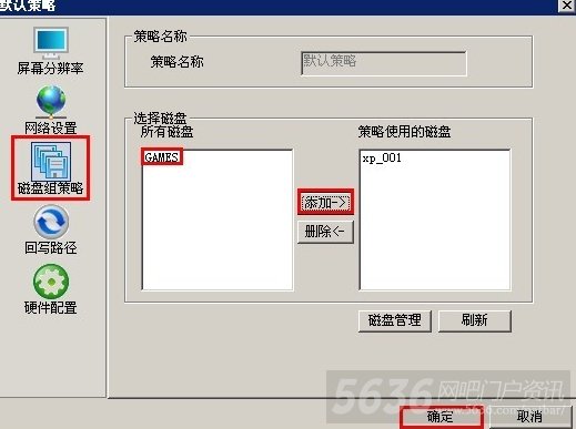 需要注意的是:缓存大小为服务端读缓存大小,大家可以根据服务器物理内存大小来设置缓存大小,设置为0表示不开启缓存。 3.再单击工具栏上的-策略配置,选择-磁盘组策略,大家把右侧磁盘组策略中的物理磁盘添加到策略使用的磁盘,单击确定!