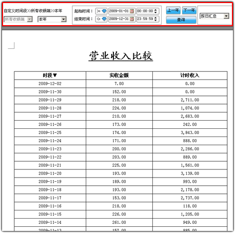 点击营业收入比较,在上方设置好查询条件,如设置查询本年的营业收入,并按日汇总,点击查询即可进行查询操作:
