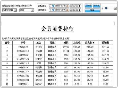 从收银端主界面上点【日常管理->老板查账->老版查账】,进入后在【消费排行榜】中即可查询到会员消费排行,同时在【消费排行榜】下还可以查询到【上机消费排行】、【会员加钱排行】和【商品销售排行】: