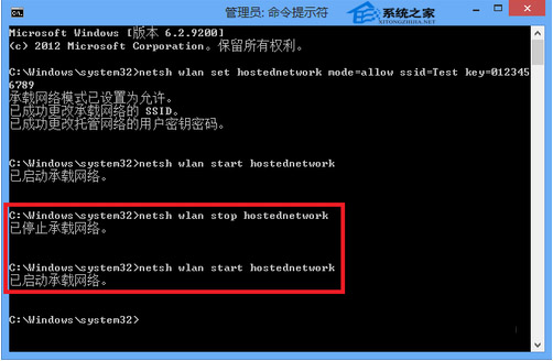 8、在最后一步操作完毕后,建议大家再命令提示符中,先关闭承载网络,再启动承载网络,相当于重启一次,如下图所示: