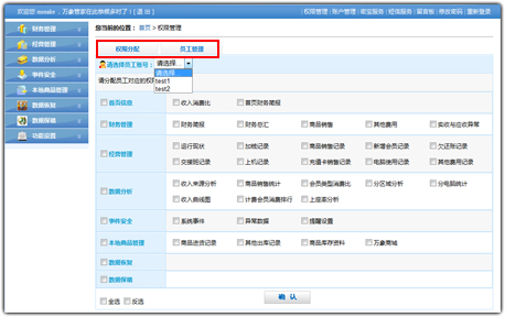 如图,权限管理中有“权限分配”和“员工管理”两个功能,上图为权限分配的设置,先选择好要设置的员工账号,再设置下边对应的权限即可。下图为员工管理: