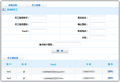 如图,在“员工管理”中,可以直接添加员工的账号、密码、联系方式等信息,同时下方有已添加员工的列表。