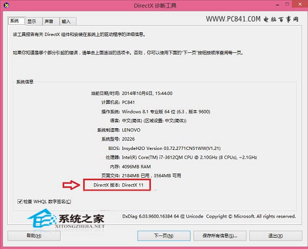 二、在打开的Directx诊断工具“系统”选项卡下,就可以找到Win8或者Win8.1的Directx版本了,如下界面图所示,Win8.1集成的Directx版本是Directx11。