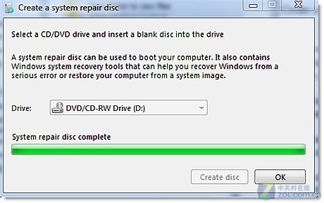 3.完成上述步骤后,你会看到系统创建进程条。Windows 7系统创建恢复光碟仅需几分钟。完成点击“确定”即可。