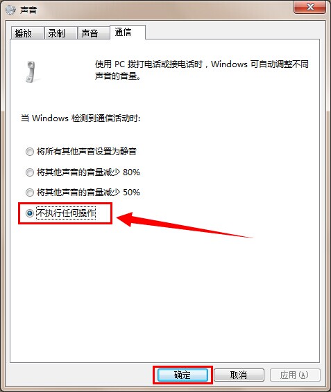 2.在打开的声音设置界面,切换到“通信”项,点击选择检测到通信活动下的“不执行任何操作”选项,点击确定完成设置。如下图所示