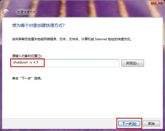 2. 在创建快捷方式窗口中,我们在对象的位置中输入“shutdown –s –t 5”指令,然后点击“下一步”按钮,如下图所示