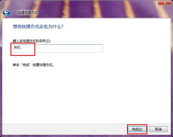 3.将快捷方式命名为自己想要的名称,这边建议修改为“关机”比较 一目了然,点击完成进入下一步操作。如下图所示
