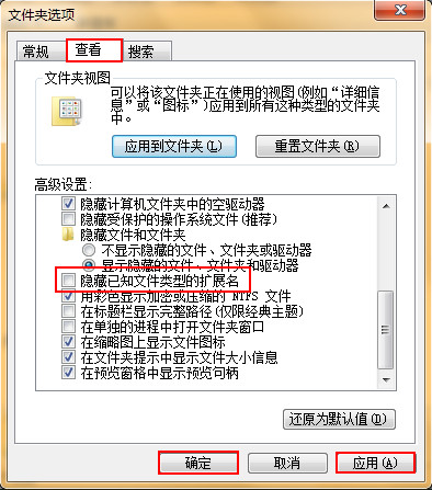 2、在文件夹选项窗口中,点击“查看”选项卡,在高级设置中找到“隐藏已知文件类型的扩展名”选项,并且将其取消勾选,最后点击“应用—确定”即可,如下图所示: