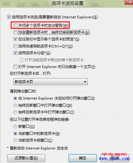 系统默认“关闭多个选项卡时发出警告”是选中的,如果不想在启用和禁用关闭多个选项卡时会发出警告,就将此选项出掉。重启IE生效。