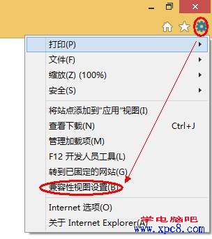1)点击设置“齿轮”,再点击兼容性视图设置,如下图: