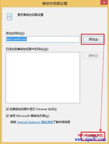 2)点击“添加”按钮来添加要使用兼容模式的网站,并点击“关闭”;