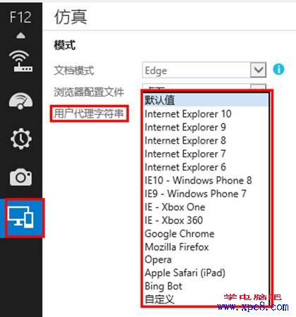 3)在桌面IE模式中,按键盘“F12”按钮调出左侧;黑色菜单,如右图,选择最后一项,将用户代理;字符串选择为IE10、IE8、IE7、IE6试试。