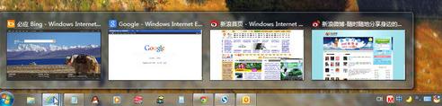 在Win7中,将鼠标停留在任务栏左侧的某个程序图标上,任务栏中该程序图标上方即会以显示该类已经打开所有内容的小预览窗口。