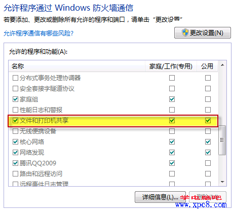 打开“控制面板/系统和安全/ Windows 防火墙”检查一下防火墙设置,确保“文件和打印机共享”是允许的状态。
