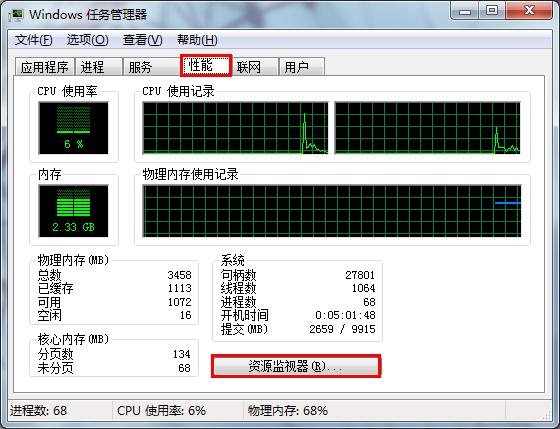 2、打开Windows任务管理器窗口后,切换到“性能”标签,我们可以在下方找到“资源监视器”按钮,如下图所示: