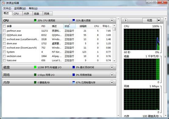 3、点击“资源监视器”,我们便能够看到系统中网络磁盘内存CPU的运行使用情况了,如下图所示: