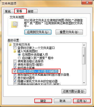 2、在文件夹选项中,点击“查看”选项卡,然后在高级设置中找到“始终显示图标,从不显示缩略图”设置,将其勾选,最后点击“应用—确定”按钮,如下图所示: